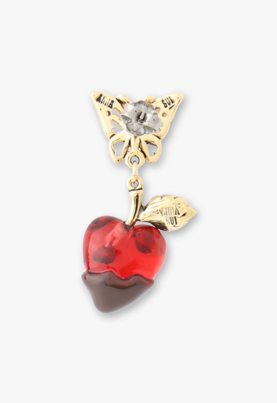 - These dangling earrings feature a glittering butterfly motif attached to the base of the studs, accompanied by bejeweled, chocolate covered strawberry charms.
