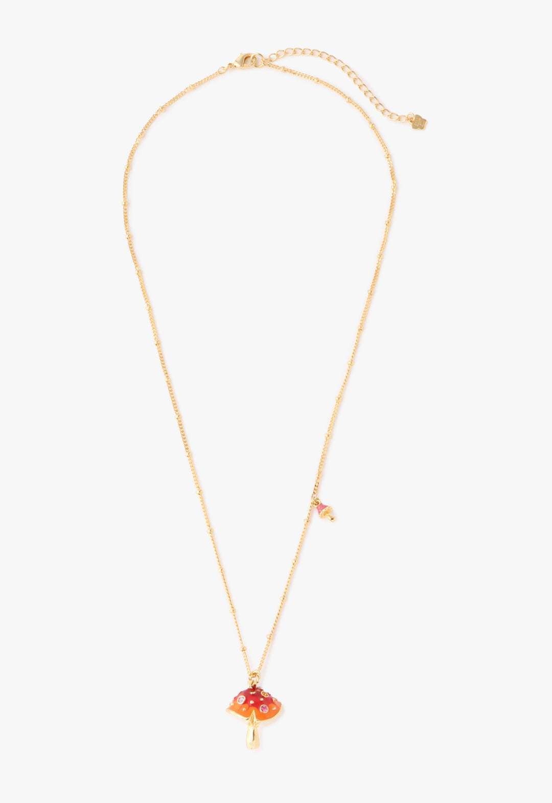 Step into a world of enchantment. This princess-length necklace features a beautifully stylized chain adorned with a striking red multi mini mushroom pendant, bringing a playful yet sophisticated touch to your look. The design is finished with a delicate micro mushroom charm, adding an extra layer of whimsy.
