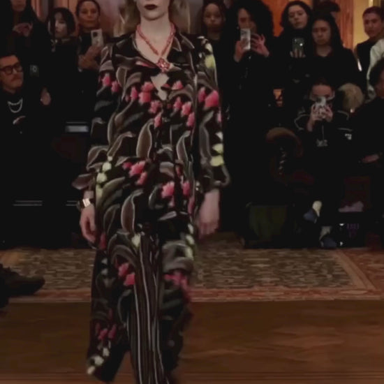 A feather-fern print and soft ruffles at the sleeves and neckline bring playful detail to this effortlessly chic dress. Lightweight and flowy, it’s designed for easy movement and standout style.