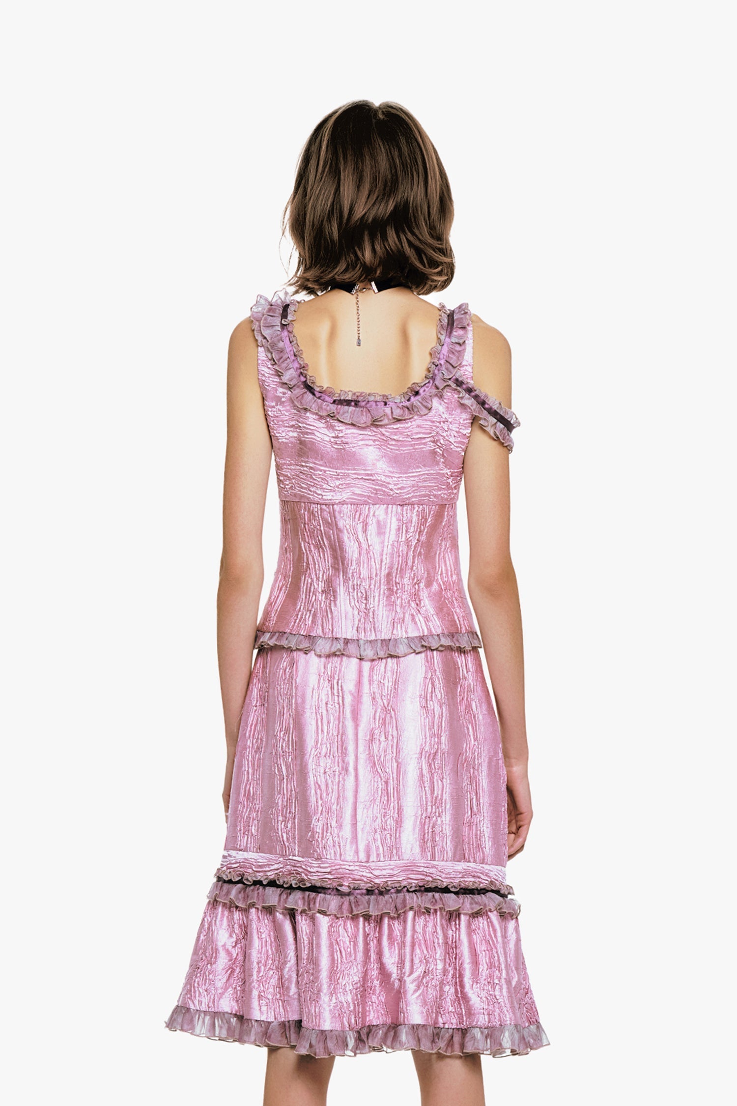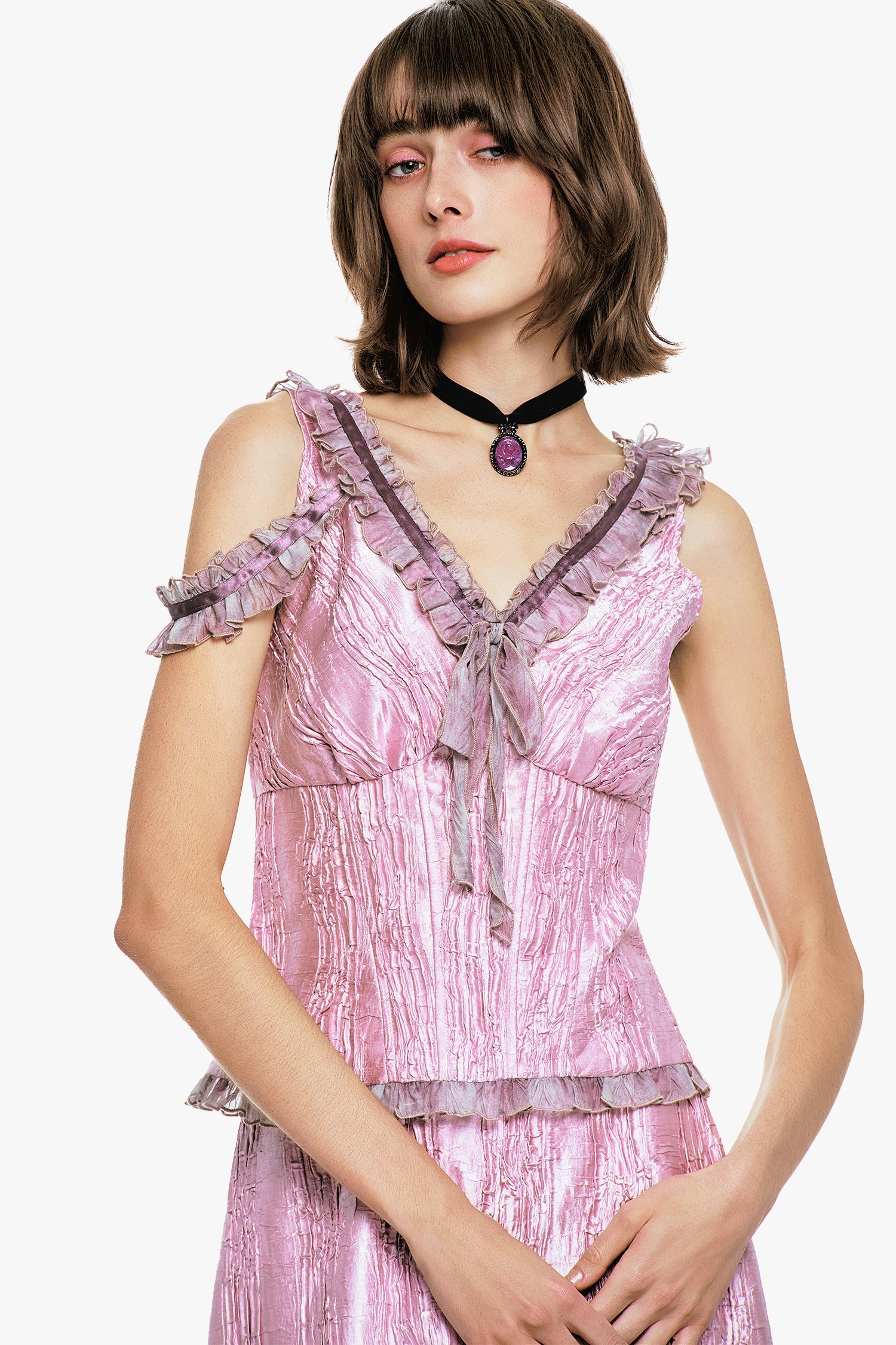 Delicate and dreamy, the Crushed Satin Bow Top features a delicate V-neckline accented with ruffle trim and a feminine bow detail. Made from shimmering crushed satin in pink, this piece offers an effortlessly elegant look that transitions beautifully from day to night.