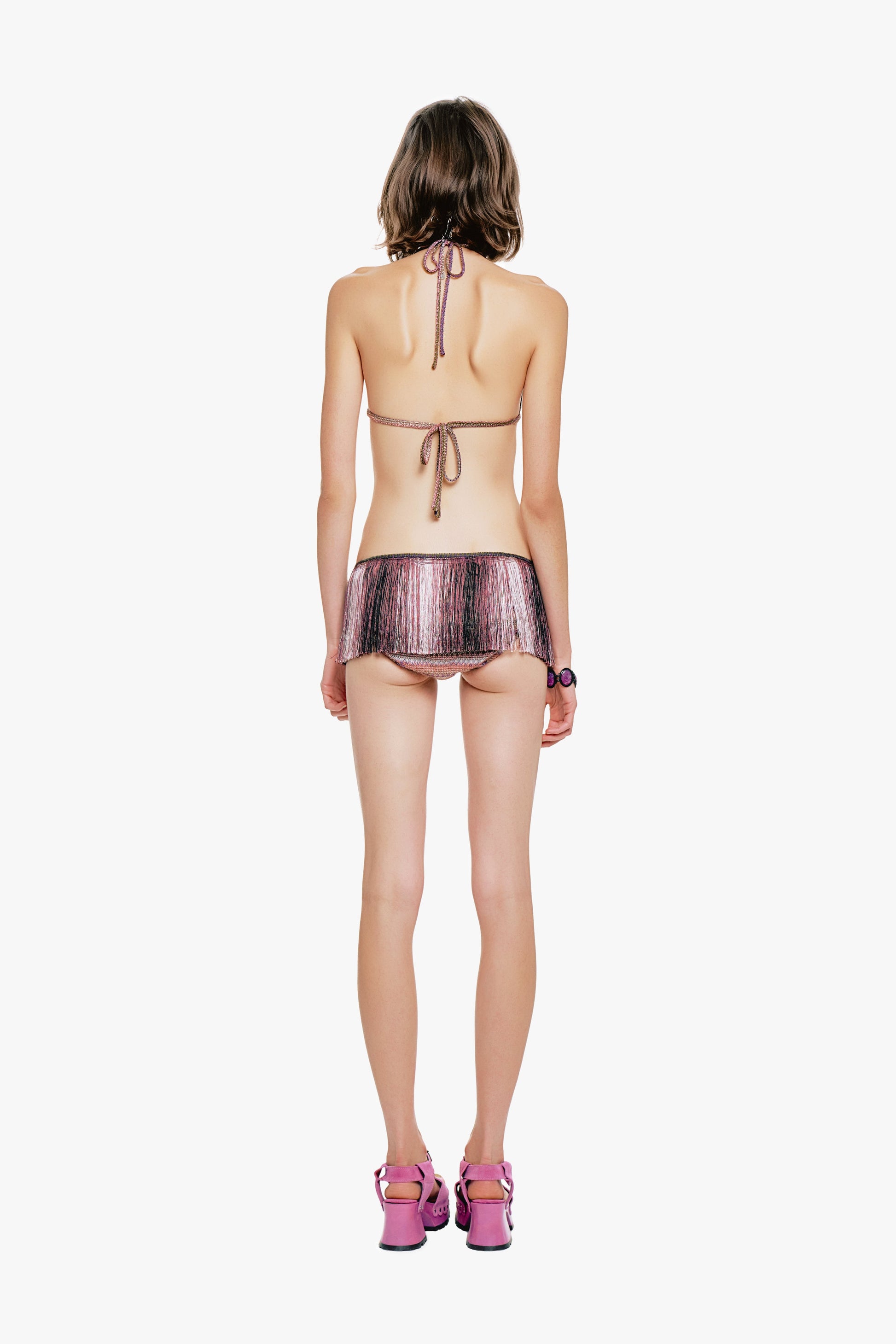 This playful two-piece set is perfect for lounging and soaking up the sun—please note, it is not a functional bathing suit. Crafted in a soft, wavy chevron knit, the bikini features vibrant stripes and charming fringe details on the bottoms, adding movement and whimsical flair. Effortlessly stylish, it’s the ultimate piece for sunbathing in Anna Sui’s signature eclectic, playful style.