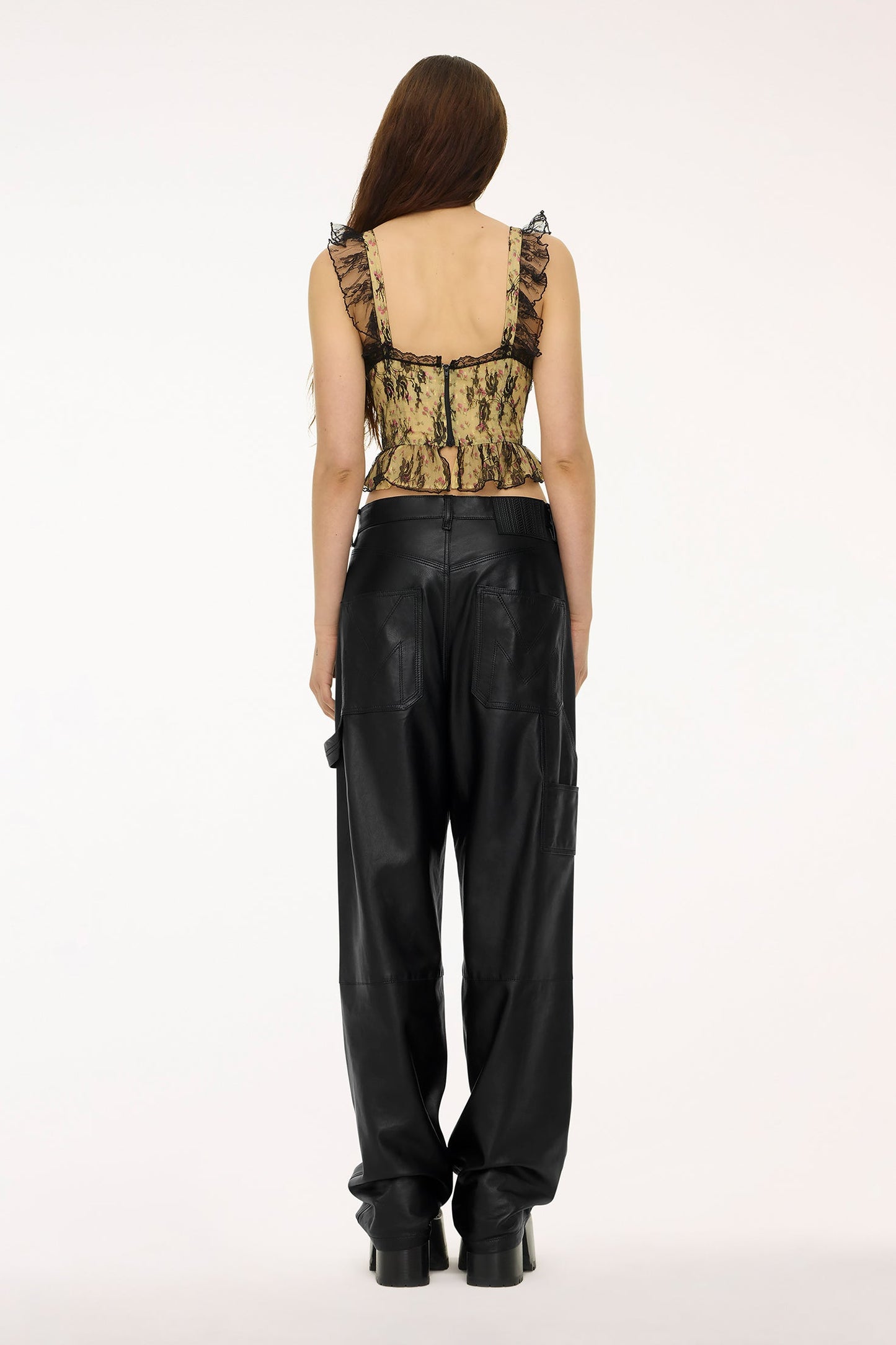 - Fitted lace tank top with a floral base and sheer lace overlay. Features a heart shaped bust with lace bow detail at the waist.