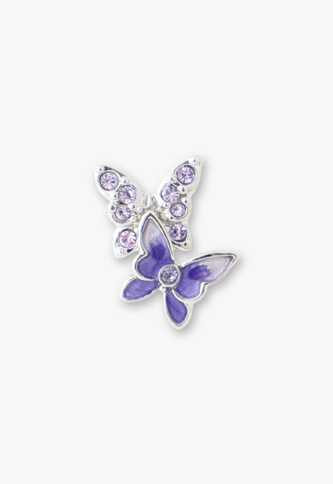 These stud earrings feature a purple, bejeweled butterflies motif.