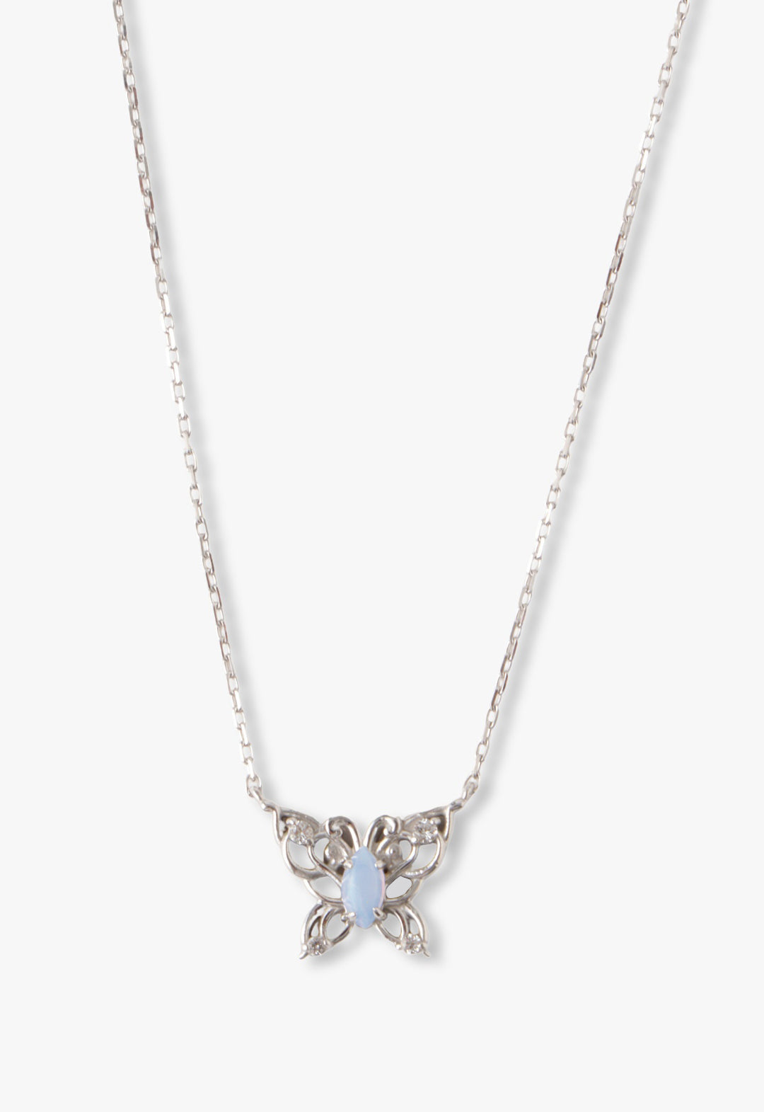 This delicate piece features a stunning silver butterfly adorned with shimmering opal and white topaz gemstone. The gentle curve of the butterfly's wings and the soft glow of the gemstones create a truly magical accessory. This dainty necklace is perfect for layering or wearing on its own, making it an ideal choice for both everyday wear and special occasions.