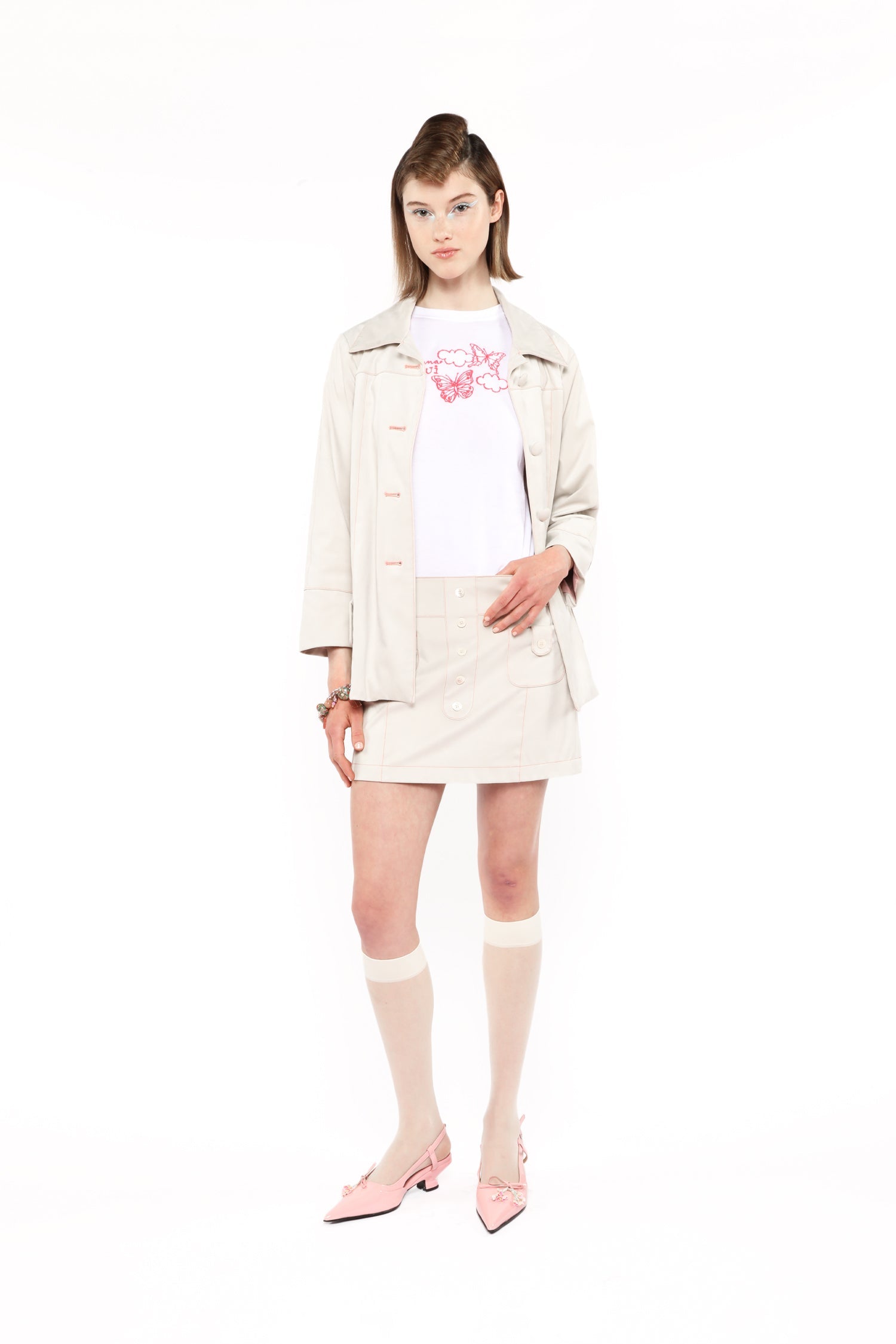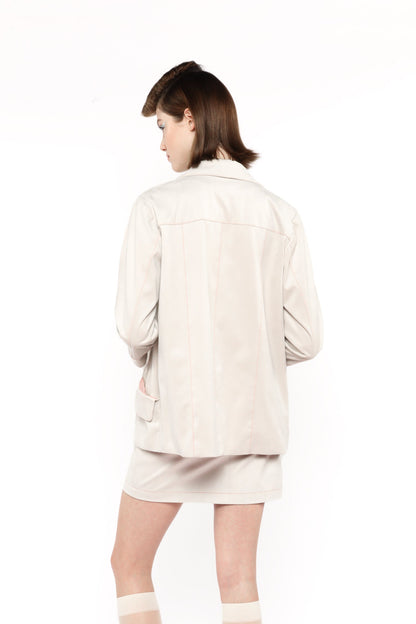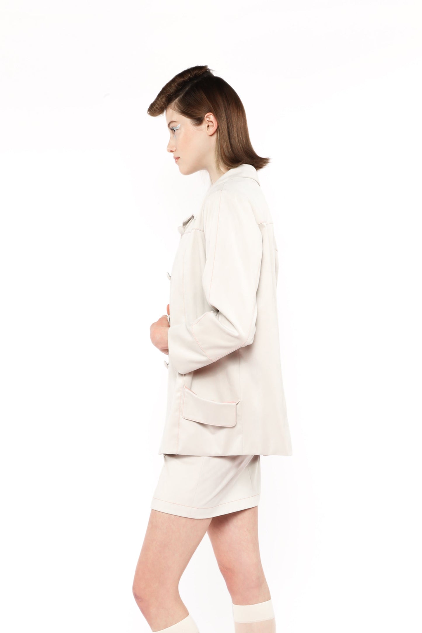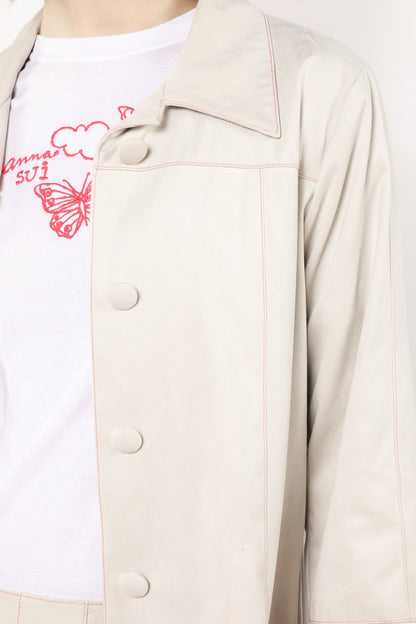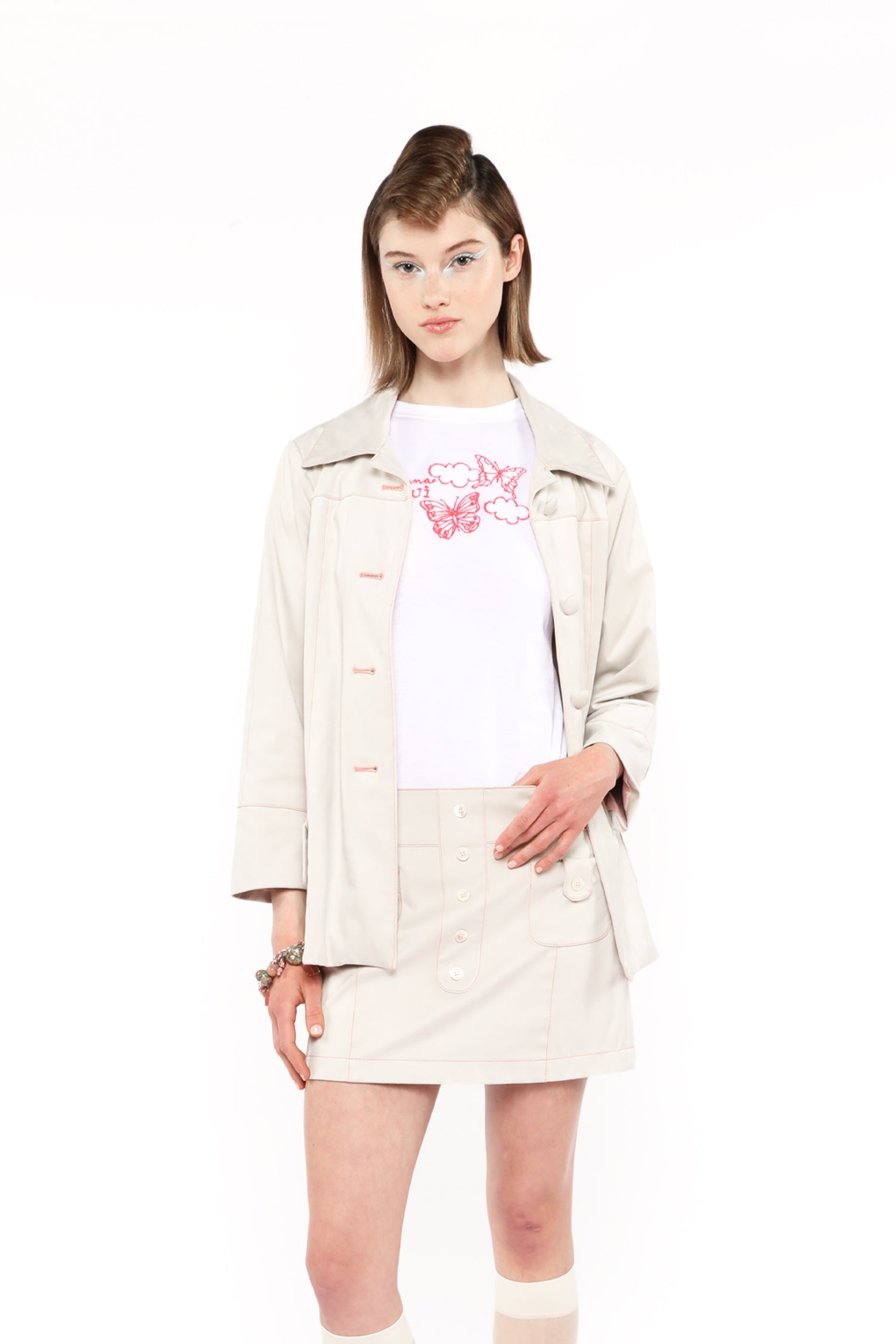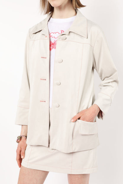 Stay stylish and cozy in our Faux Suede Coat. Featuring a classic collared design and convenient pockets, this coat is made in a beautiful cream color with delicate pink thread detailing for a subtle pop of contrast. Perfect for layering over any outfit, it combines elegance with comfort for the ultimate wardrobe staple.