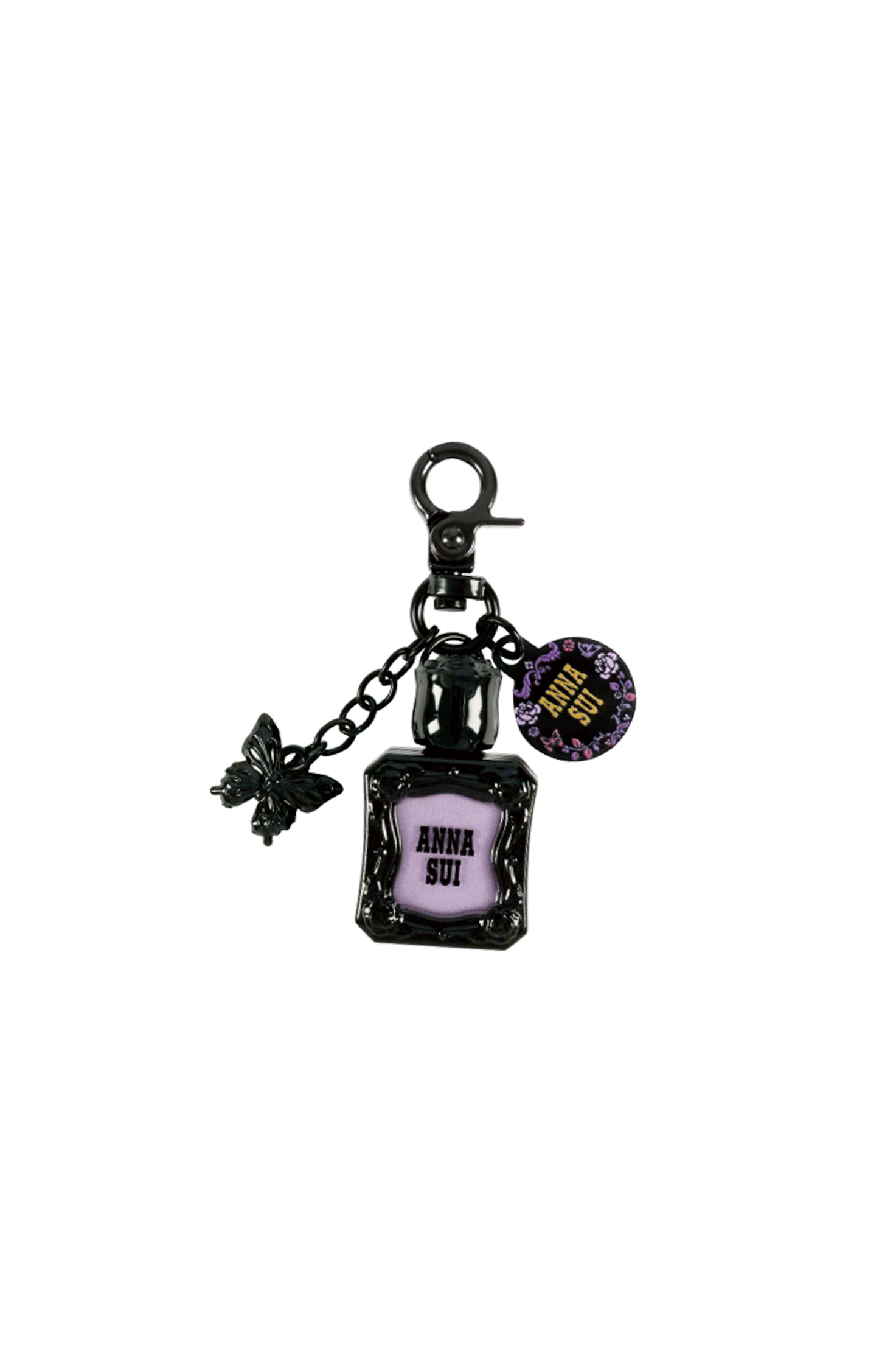 Each miniature captures the unmistakable Anna Sui aesthetic — sleek black packaging, rich purple accents, and the brand’s signature butterfly motif delicately showcased on every piece. Finished with a coordinating Anna Sui tag clipped to the chain, each design carries an added touch of luxury and authenticity.