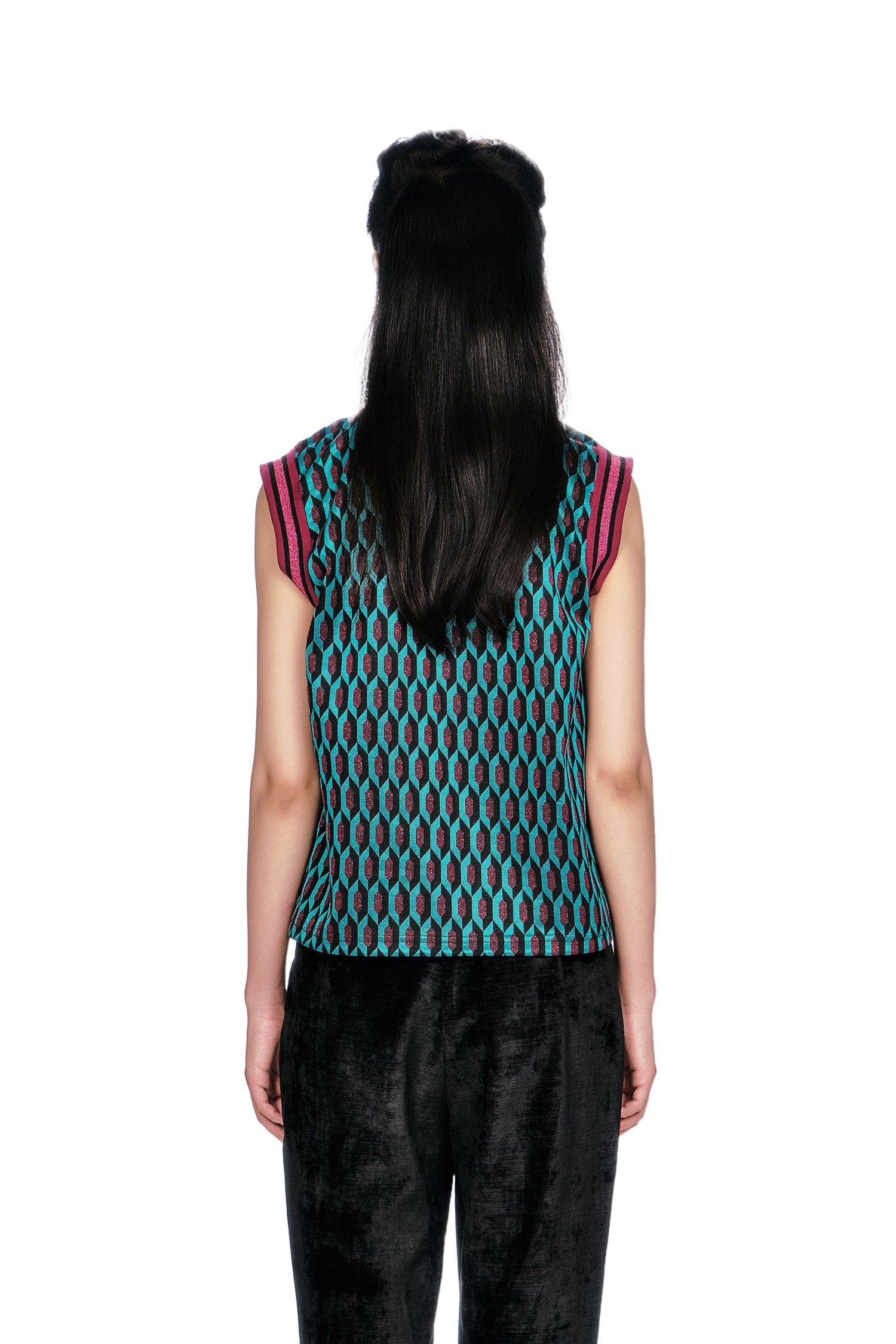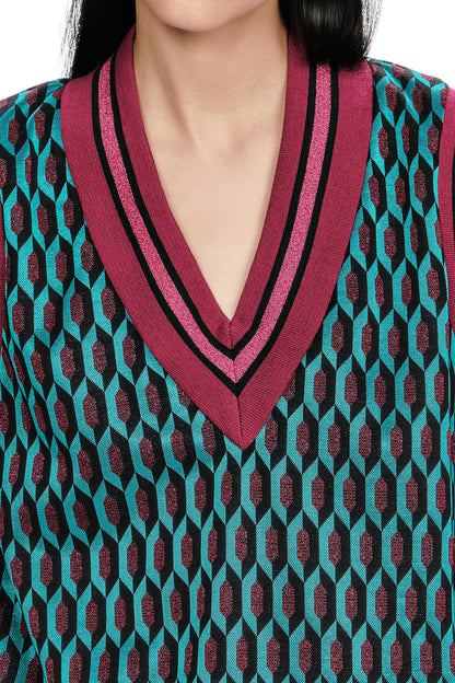 Make a statement with this glitter jacquard pullover vest, decked out in an striking geometric pattern. The bold fuchsia and pink striped trim at the V-neck and armhole add a playful, retro pop!