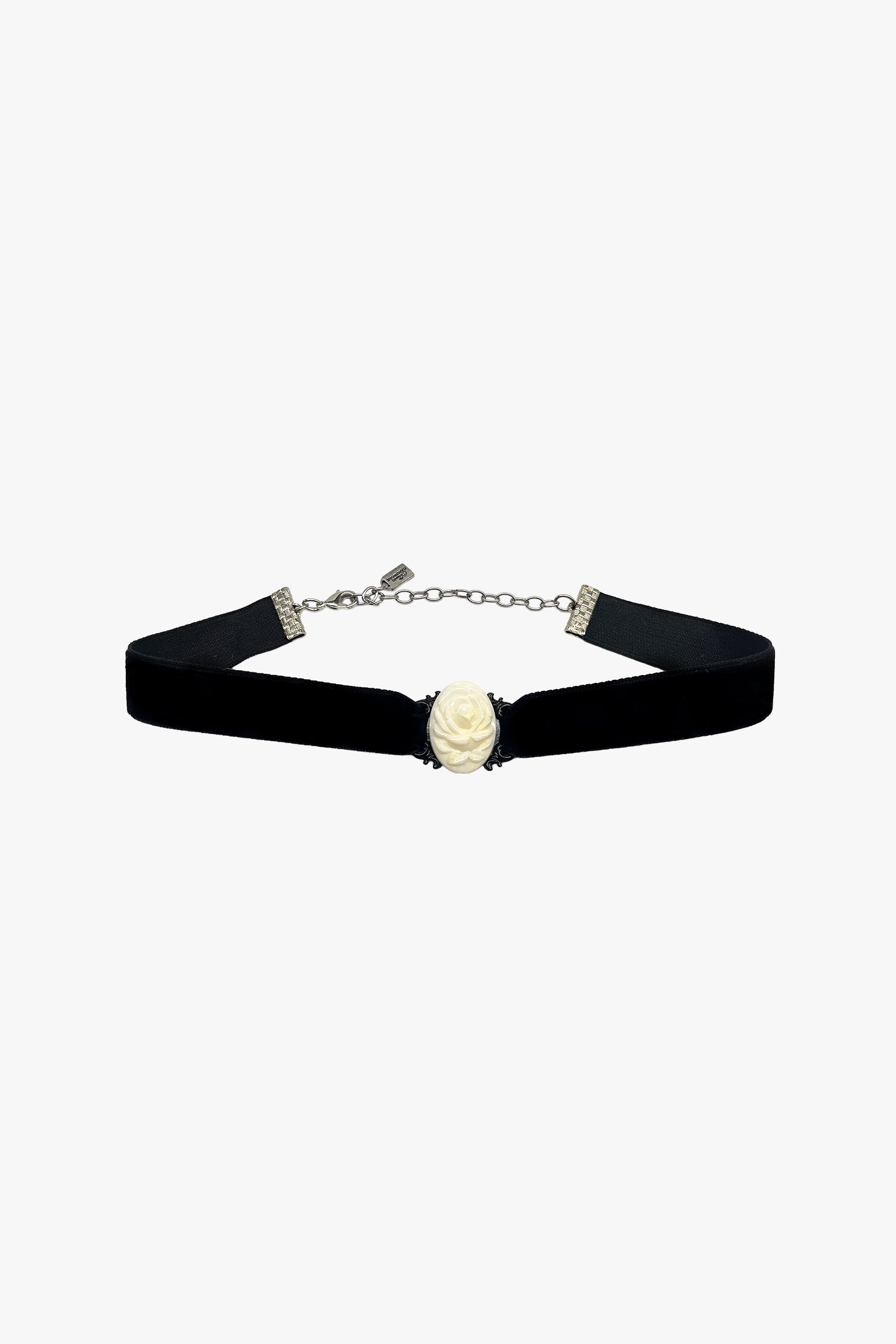 Delicate and timeless, the Ivory Rose Oval Choker rests softly on the neck with a smooth black velvet band, adjustable for a comfortable fit. At its center, a refined ivory oval rose adds a touch of elegance and sophistication, making this choker a versatile statement piece for any occasion.