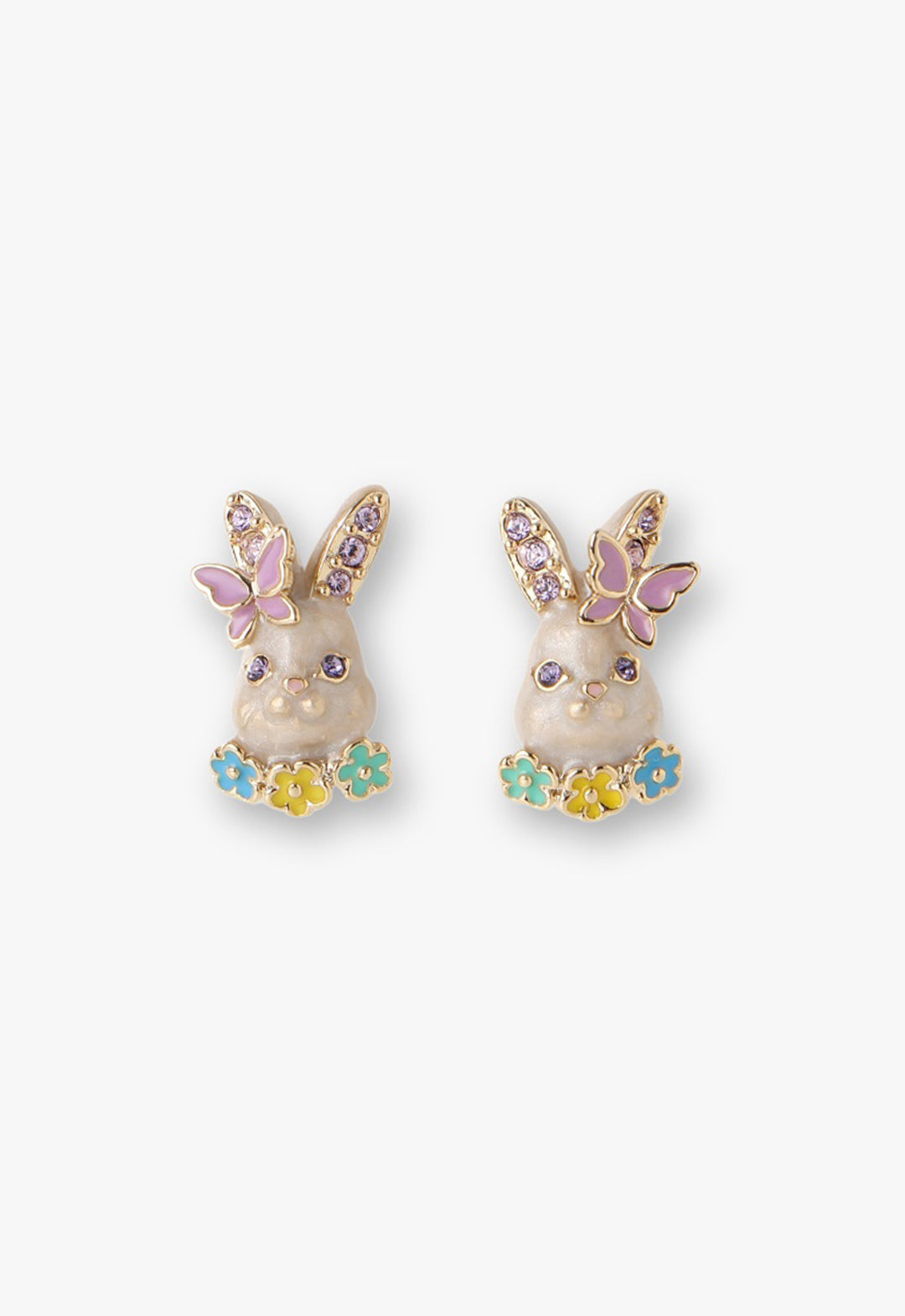 These bunny stud earrings sparkle with bejeweled eyes and ears, accented by pastel flowers and a butterfly perched on the bunny's head.
