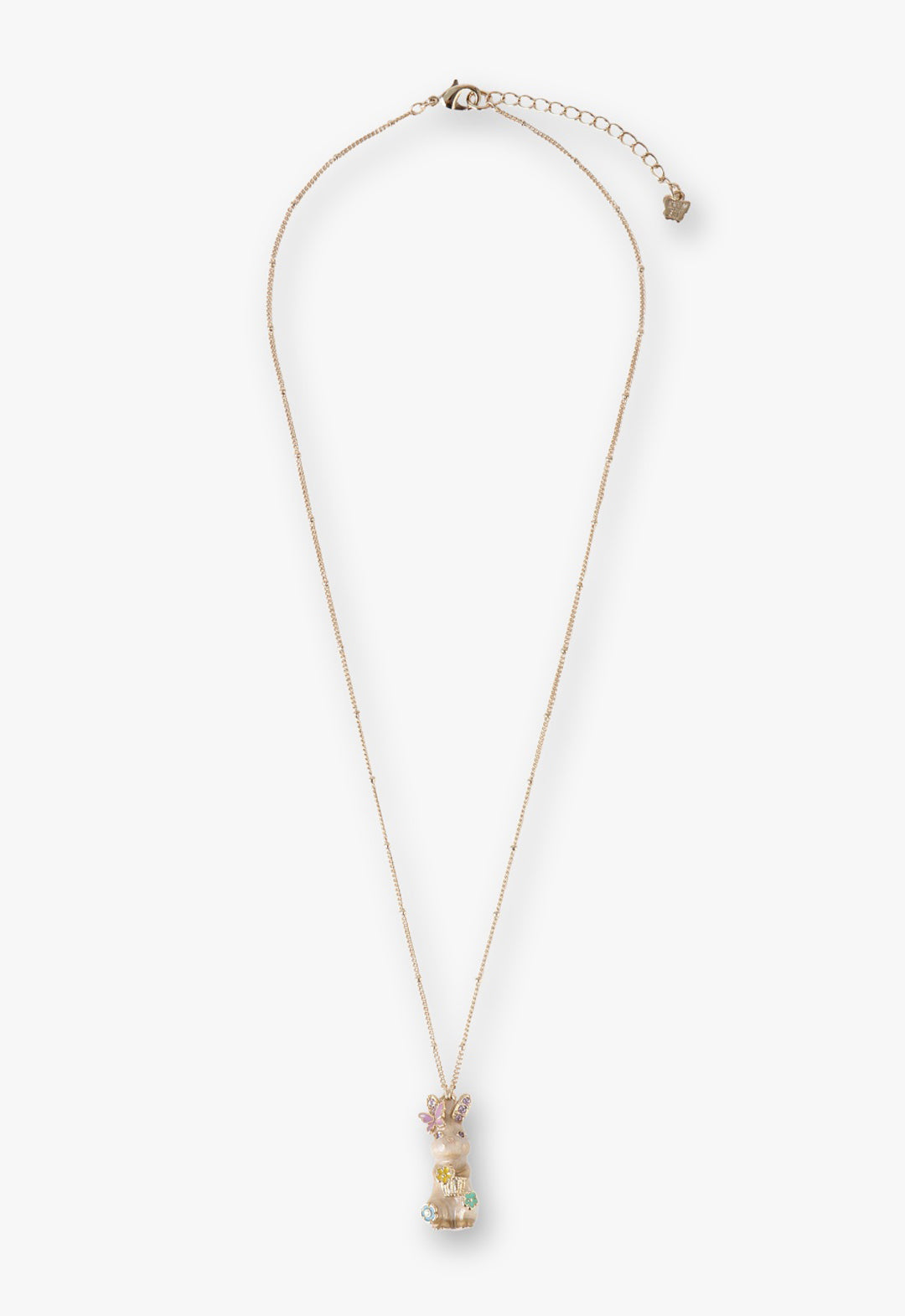 This bunny necklace features bejeweled ears and eyes, adorned with delicate pastel flowers and butterfly gently perched on its head.