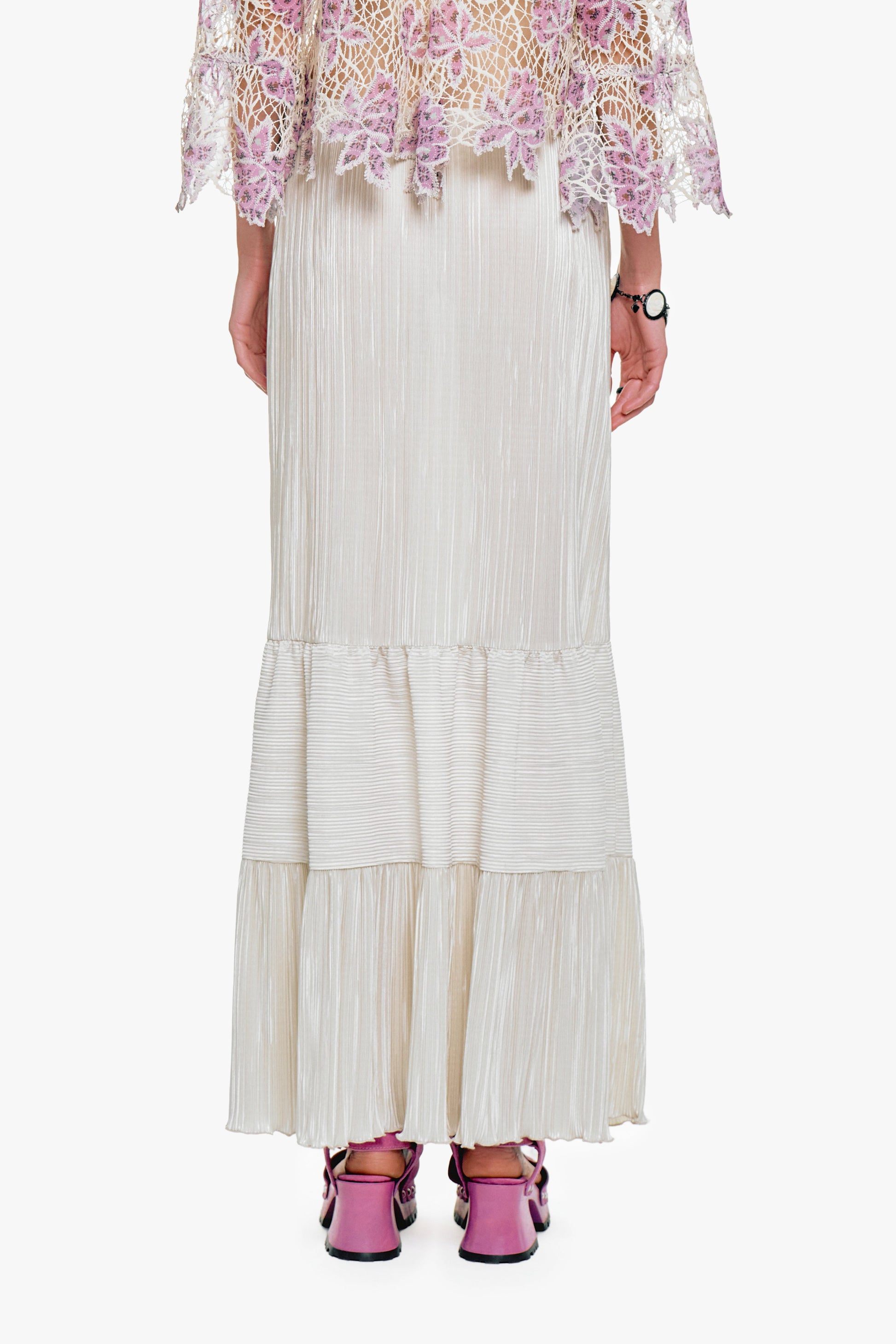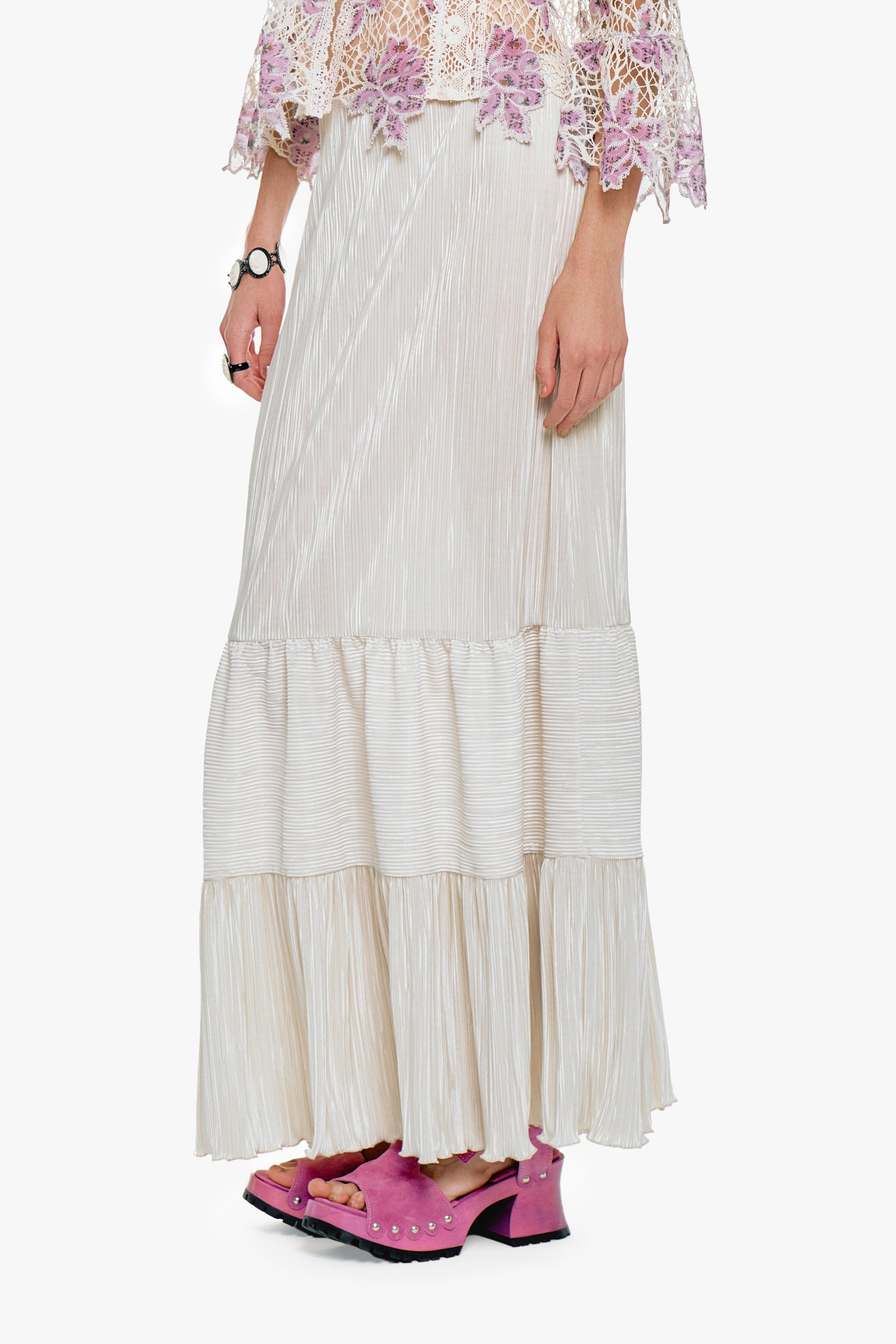 Embrace airy elegance with the Plissé Tiered Maxi Skirt in cream. Soft pleats and a tiered silhouette create graceful movement, while the light, neutral shade lends a dreamy, versatile touch to any wardrobe. Perfect for romantic daytime outings or effortlessly styled evening looks, this skirt captures Anna Sui’s signature blend of femininity and modern sophistication.