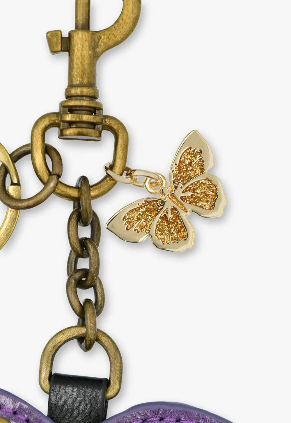 Add a bold statement with the Purple Heart Bag Charm. Bronze rivet details pair with a gold, glittering butterfly charm, making this the perfect accent to any bag. The chain comes with an additional key ring to hold your keys.