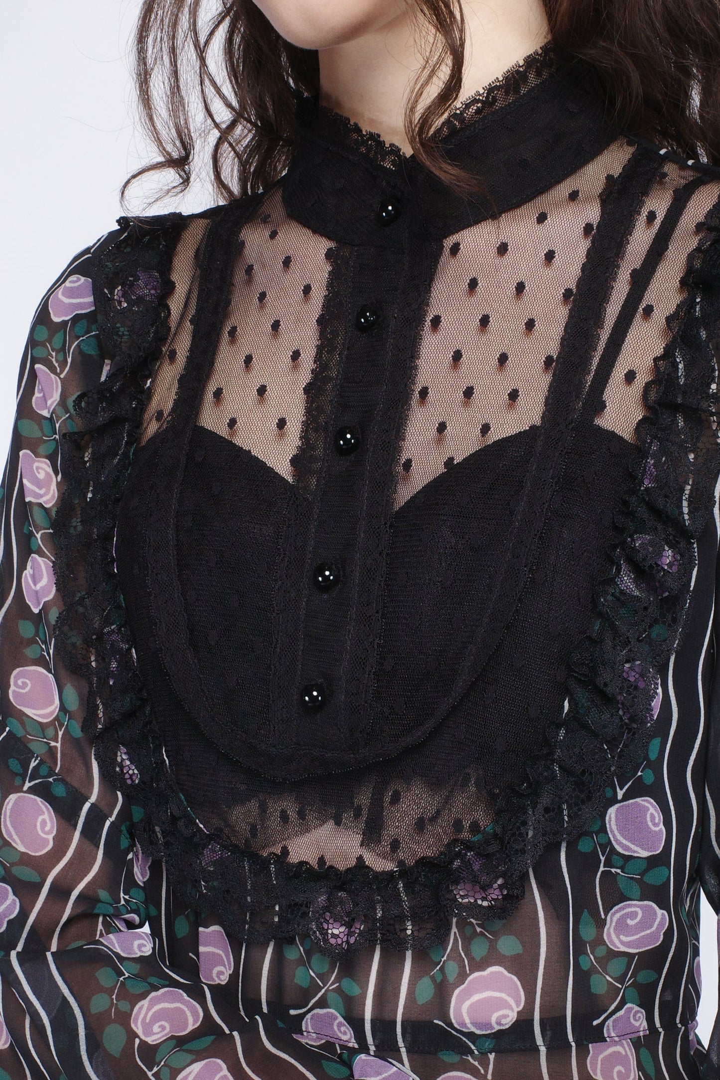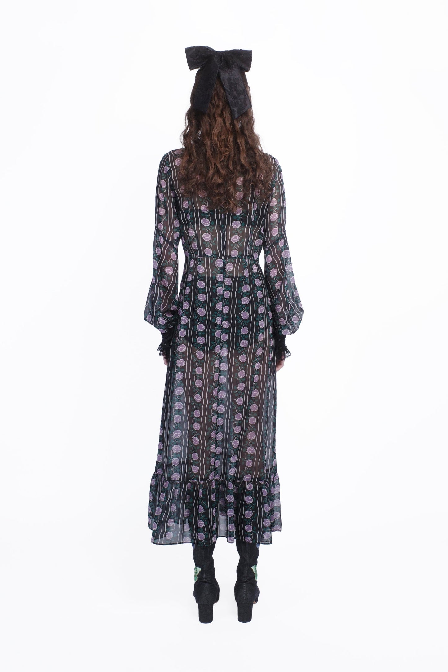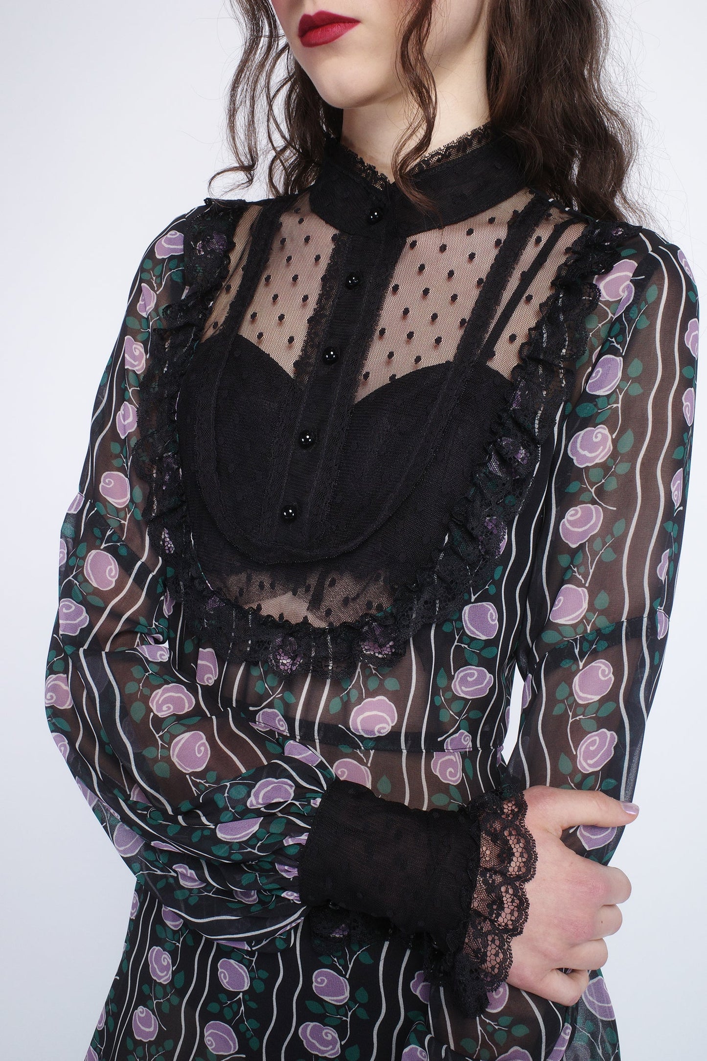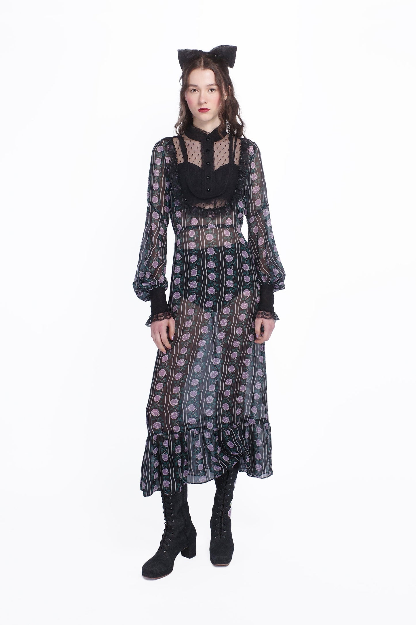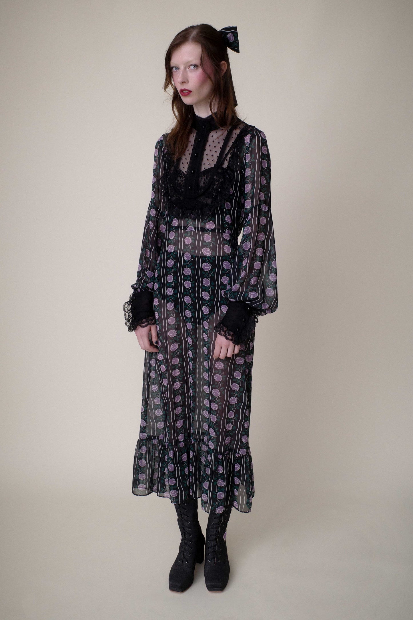 Indulge in timeless elegance with the Rosetti Chiffon Victorian Bib Dress. This exquisite maxi-length dress features long sleeves adorned with delicate lace detailing, adding a touch of romantic charm. The stunning lace bib neckline draws attention to, while the flowing chiffon fabric creates a graceful silhouette.
