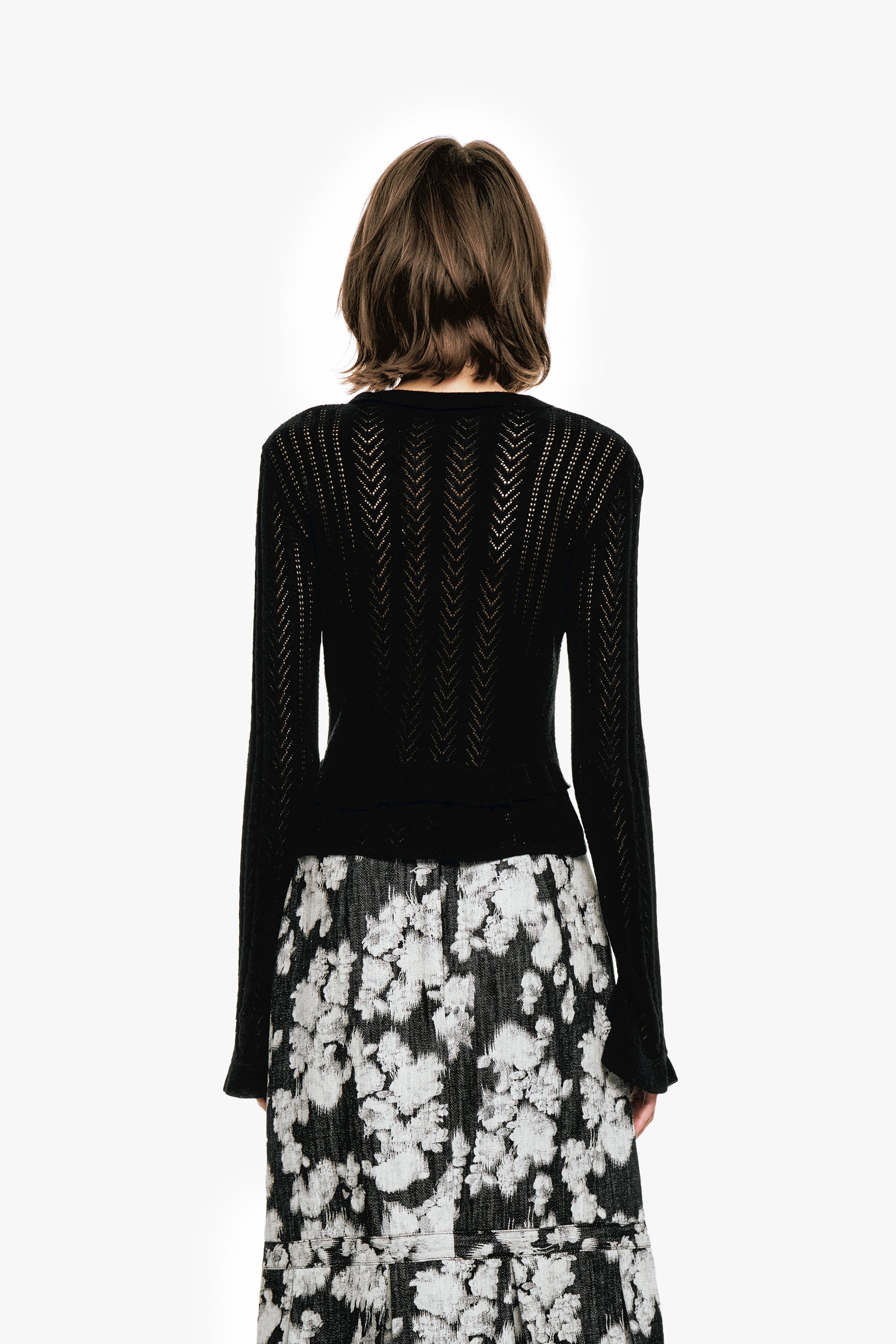 The Victorian Pointelle Knitwear Cardigan brings romantic vintage charm to your everyday wardrobe. Crafted from 100% cotton, this soft knit features a delicate pointelle design with charming ruffle details for a feminine touch. Finished with a hook-and-eye front closure, this lightweight cardigan layers beautifully over dresses or tops for an effortless, elegant look.