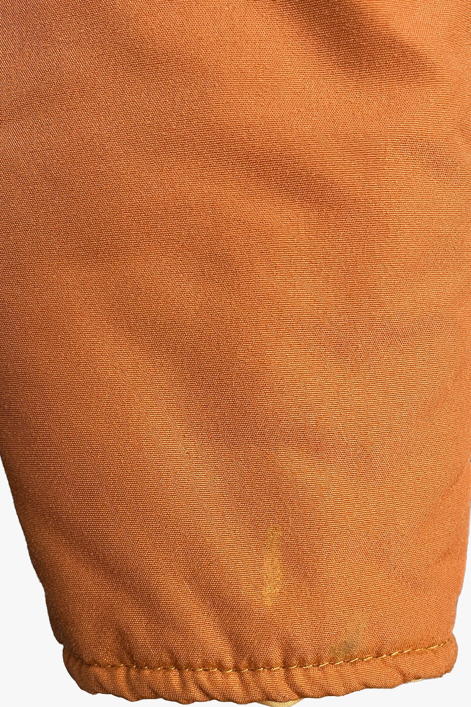 Bold, functional, and full of vintage character—this 1970s colorblock jacket brings retro utility and style together in one standout piece. Designed with a classic front zipper closure, this jacket features two zippered pockets, zipper details at the sleeve cuffs, and an eye-catching orange lining. A hidden bonus? A thin, packable hood tucked neatly inside the collar—ready when you need it.