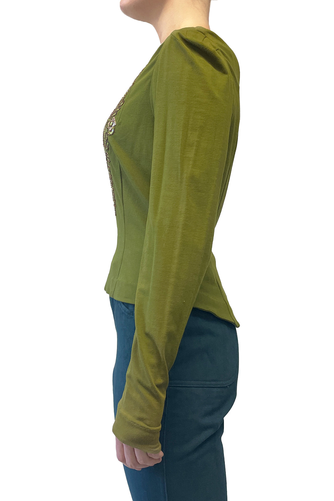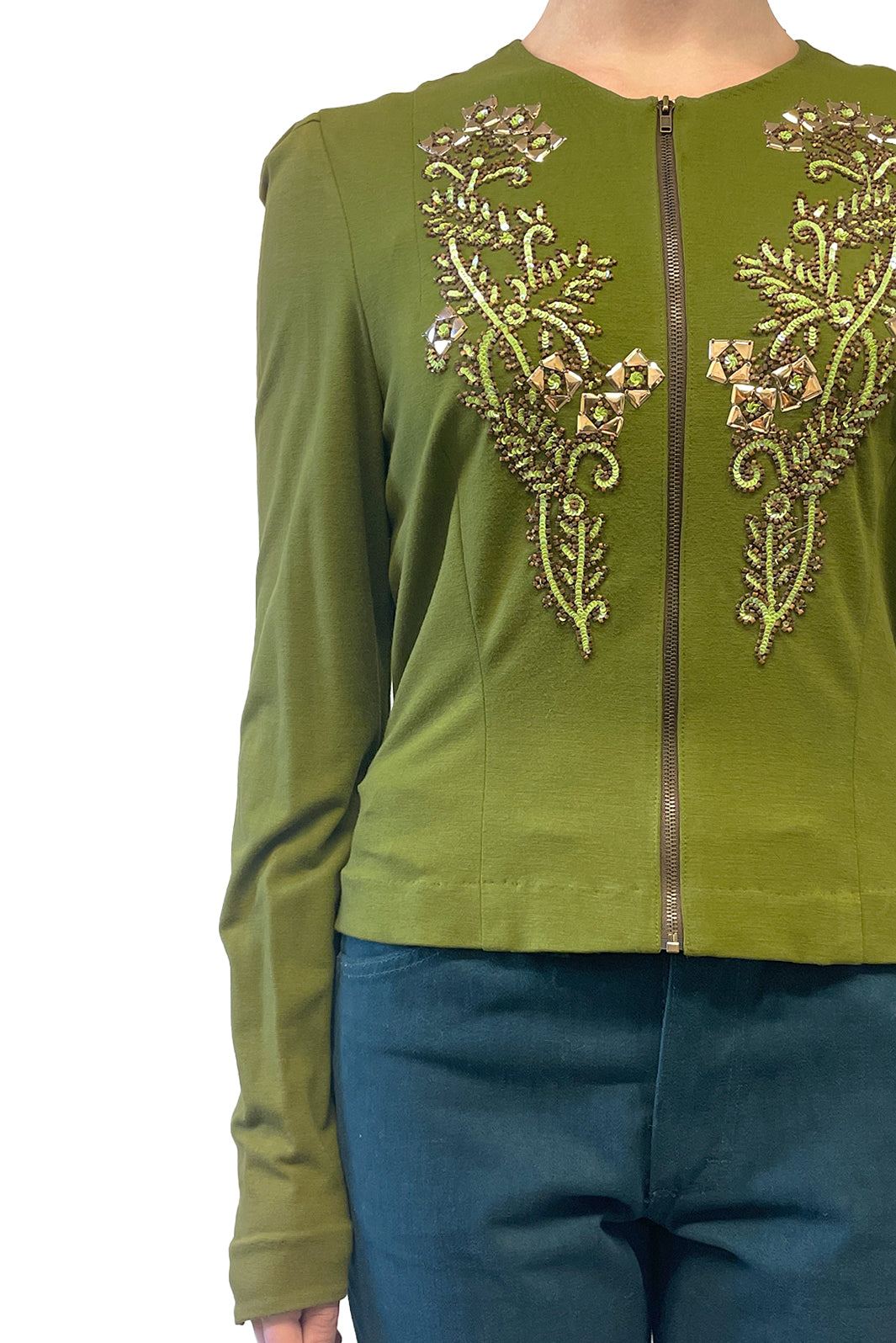 Green and brown beaded jacket with metallic geometric accents. Front zipper closure. No size tag available, fits as S.