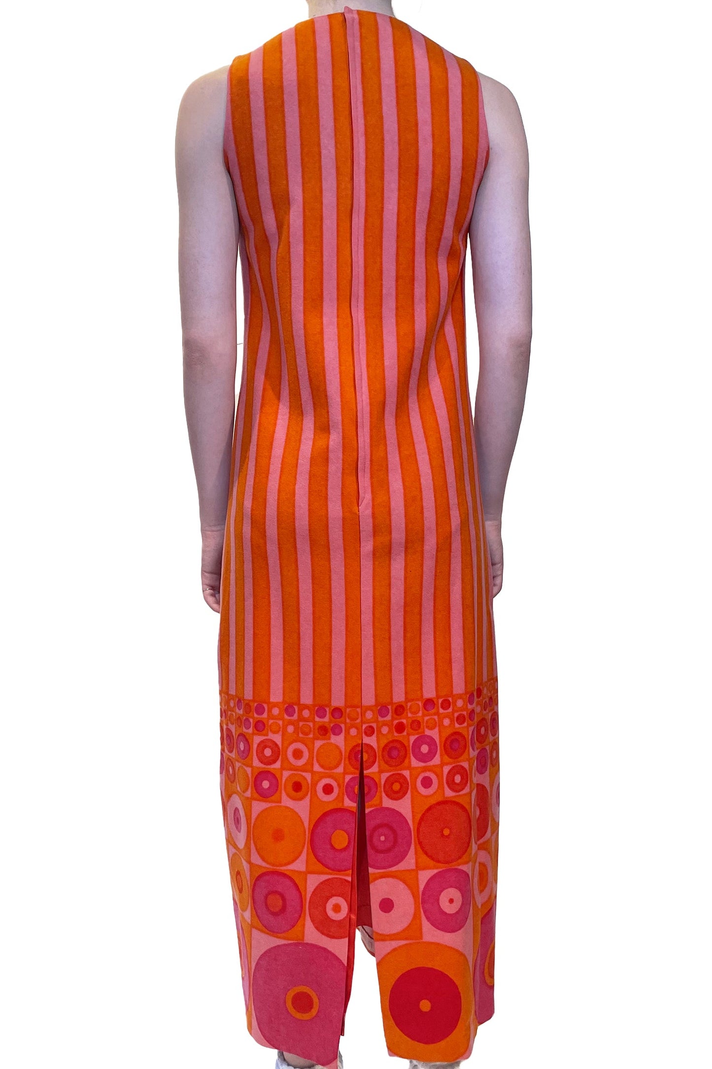 Pink and orange stripe sleeveless dress with five large buttons and a slit in the back. There is a hidden snap and a hook and eye closure. Size 36.