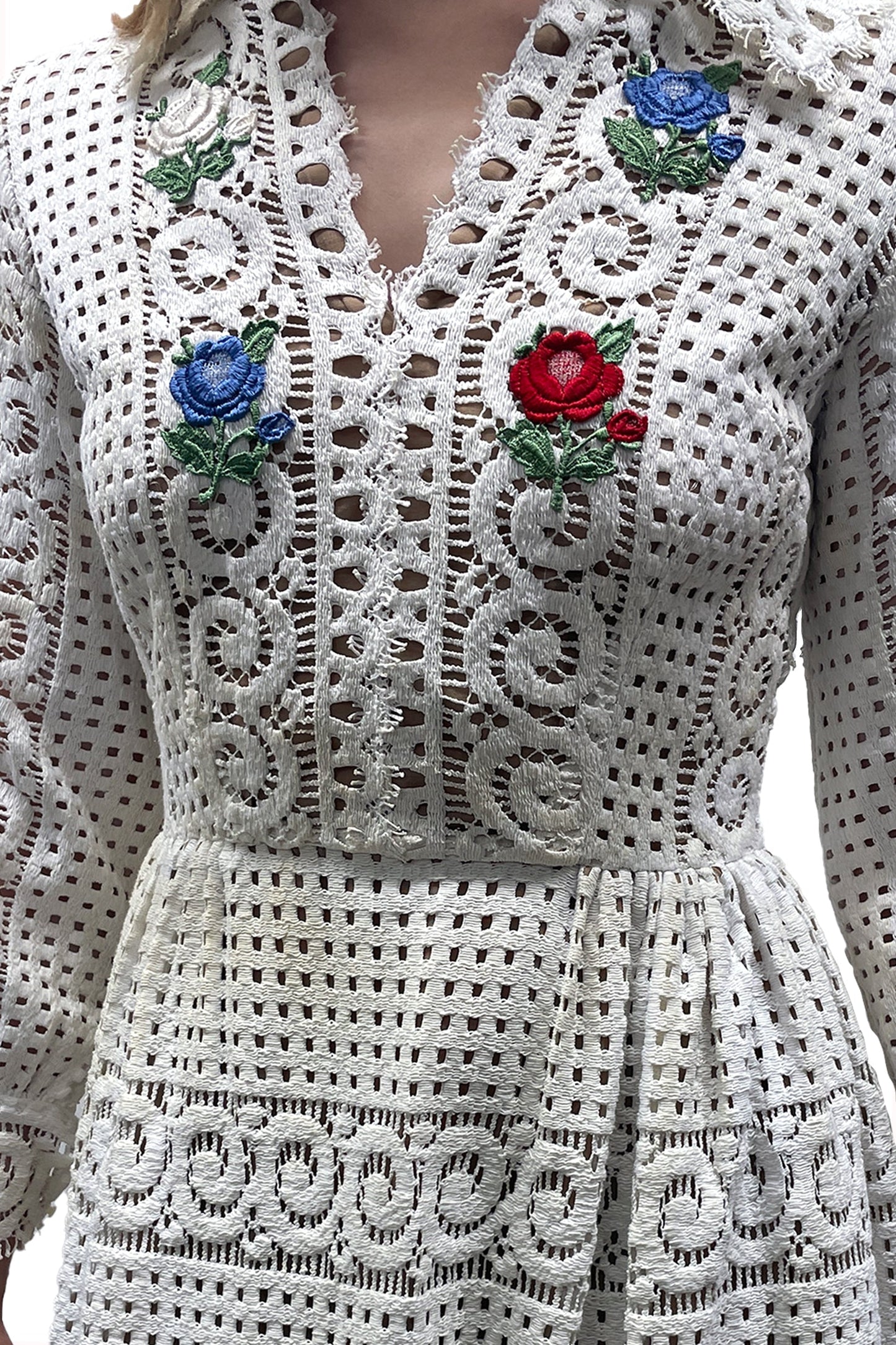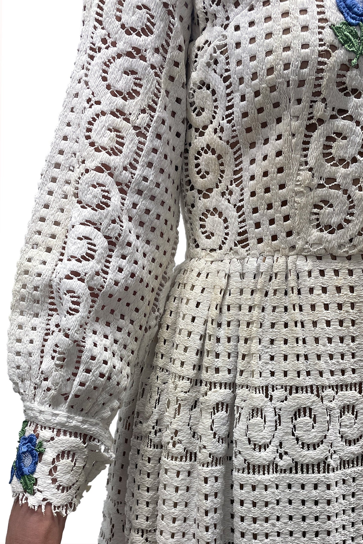 White embroidered floral maxi dress with v neck collar, back zipper closure, and snap button closure on wrists. No tag available, fits as size XS.